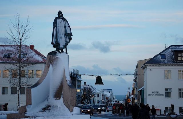 This is the view from the front of the Hallgrimskirkja looking down towards the harbour with a back view of Leif Erikson the Icelandic Viking who was the first European to set foot in North America.